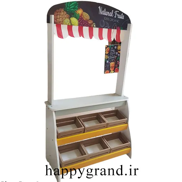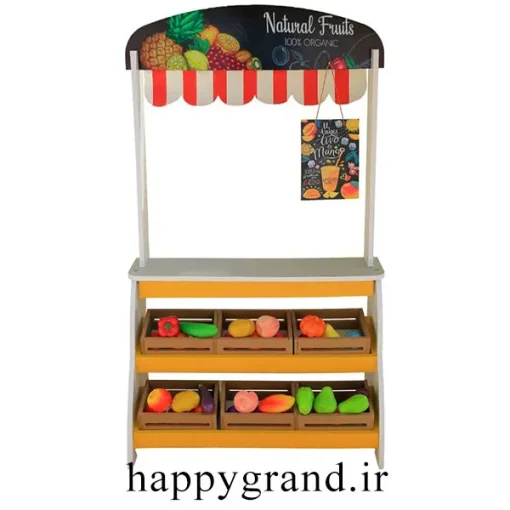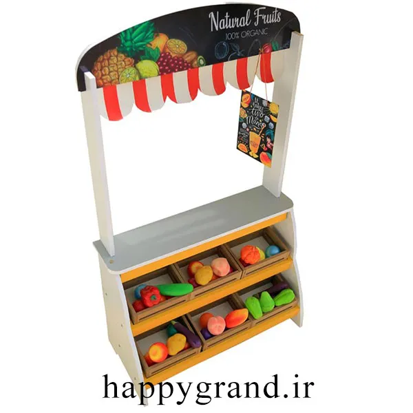 دکه چوبی فروشگاه بهار کودک به همراه تعدادی میوه و 6 باکس میوه ارائه میشود و بازی را برای کودک طبیعی تر و لذت بخش تر می کند